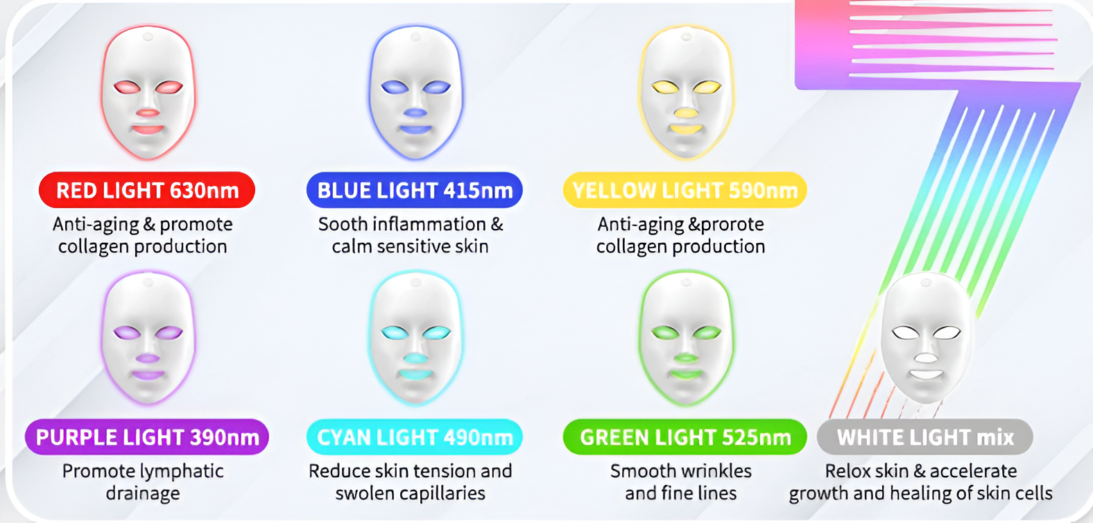- 🌈 7 Lichtstanden – Elke kleur heeft een specifieke werking: rood voor anti-aging, blauw tegen acne, groen voor pigmentvlekken, enz.